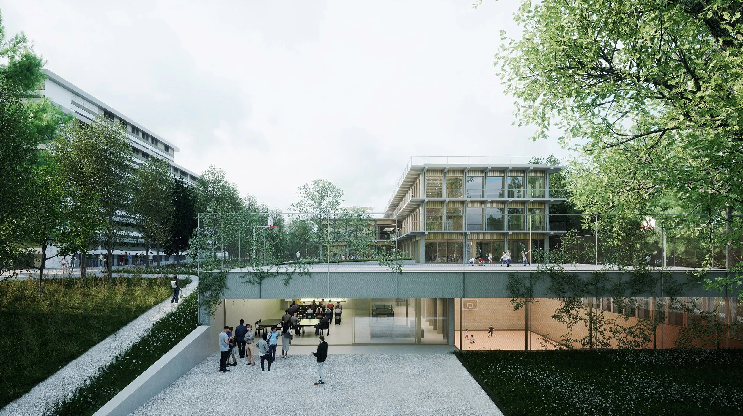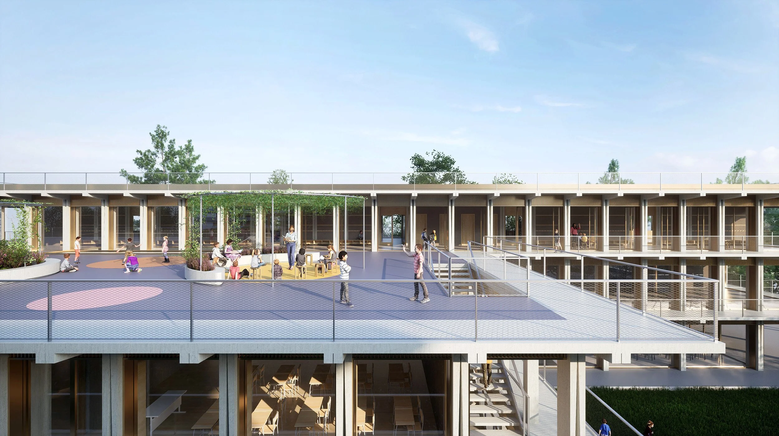 Le projet met l’accent sur la flexibilité et l’ouverture des espaces vers l’extérieur (enseignement décloisonné, flexibilité pour des pratiques nouvelles d’enseignement) qui se traduit par une interface extérieur/intérieur continue et re-configurable. Les espaces de halls (distribution et usages décloisonnés) s'ouvrent totalement en été devenant prolongation des préaux, en hiver, ils se re-configurent pour offrir des espaces chauffés généreux pour l'enseignement décloisonné.
