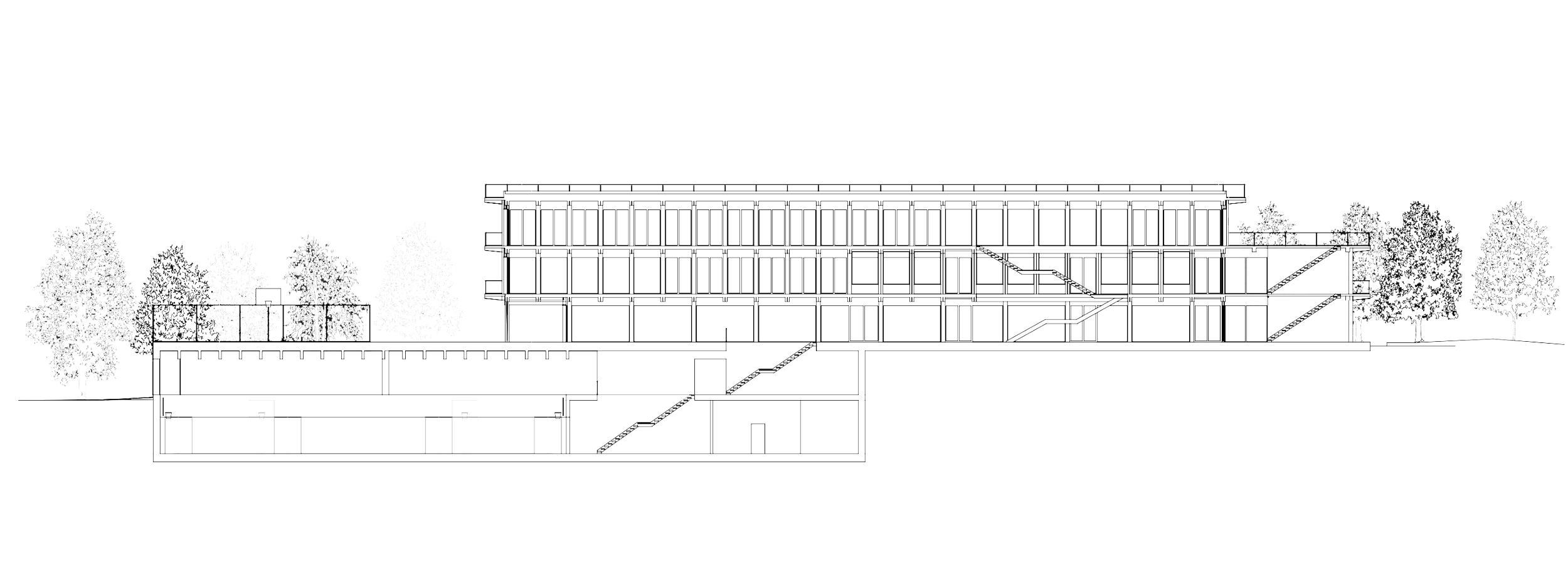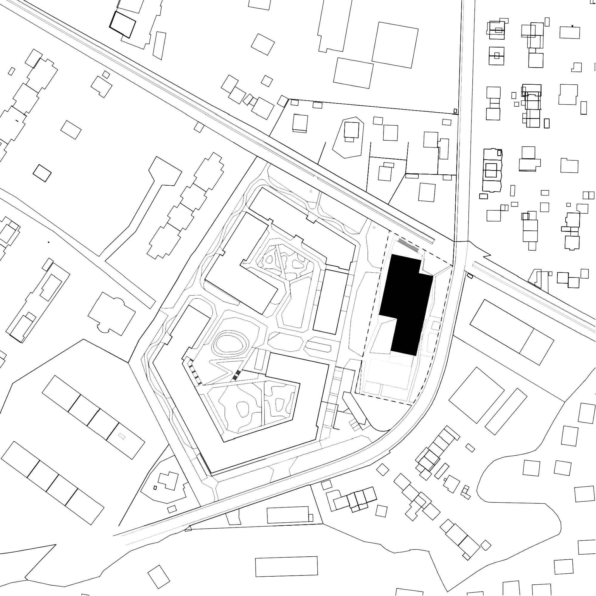 Par un système de plateaux, le projet s’insère progressivement dans le site, trouvant lorsqu’il émerge de l’horizon du futur quartier, un alignement aux bâtiments de logements projetés. Il répond par sa composition et sa position aux espaces extérieurs introvertis des futurs ilots par une respiration, une percée depuis l’allée principale du quartier vers le préau vert et les espaces de jeux, ouverts à tous. Le système est la succession des plateaux, des espaces, autant du Sud vers le Nord comme du Nord vers le Sud, et de l’Ouest à l’Est par la géométrie de volumes superposés et décalés, initiant une relation particulière avec ces quatre situations hétérogènes.